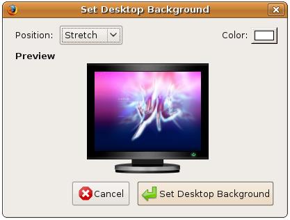 As mentioned previously, there are two ways to specify an image file for the desktop background. One way is to open an image (for example in a web browser) clicking with the right mouse button and selecting Set as Desktop Background. This will cause a dialog to appear asking how the image is to be positioned on the desktop: