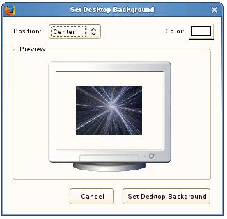 As mentioned previously, there are two ways to specify an image file for the desktop background. One way is to open an image (for example in a web browser) clicking with the right mouse button and selecting Set as Desktop Background. This will cause a dialog to appear asking how the image is to be positioned on the desktop: