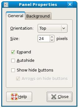 A number of configuration options are available for changing the appearance of each desktop panel. These changes are implemented using the Panel Properties dialog (accessed by right clicking on the panel to be changed and selecting Properties from the popup menu).