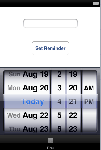 Within the project navigator, select the ReminderAppFirstViewController.m file, locate the setReminder: template stub and add the following code: