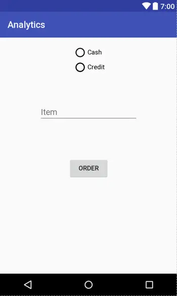 The Button widget within the user interface layout is configured to call a method named orderItem() when clicked by the user. The code within the method will identify whether the customer is paying by cash or credit card and extract the ordered item from the EditText widget. An event named item_ordered will then be logged with parameters containing the ordered item and the user’s payment method. A user property named last_ordered will then be used to record the last item ordered by the user.