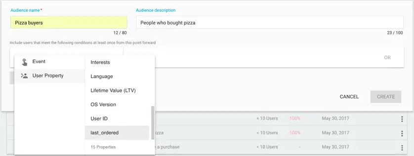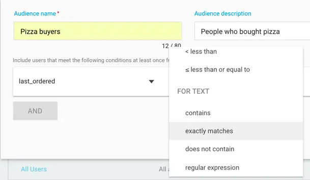 It is also possible to create audiences based on events and parameters (for example an audience could be created containing all users who logged an item_ordered event with the payment method set to cash). Although user properties are available for use with audience creation, it can take up to 24 hours for a custom event type to appear as an option in the audience creation menus.
