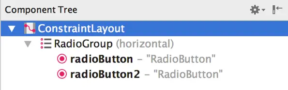 Open the activity_analytics.xml file in the layout editor and select and delete the default TextView. From the Containers section of the widget palette, locate the RadioGroup object and drag and drop it into position on the layout canvas. Switch the palette to the Widgets category, then drag and drop two RadioButton instances onto the RadioGroup entry in the Component Tree panel as outlined in Figure 41‑2: