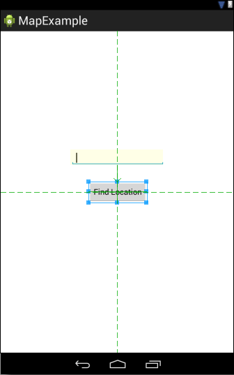 Locate and double click on the res -> layout -> activity_map_example.xml file and, using the Graphical Layout tool, delete the default “Hello world!” TextView object. With a clean user interface layout, drag and drop a Button view onto the layout canvas and position it so that it is centered both horizontally and vertically within the parent layout manager view. Change the text on the button to read “Find Location”. With the button positioned, drag and drop an Address EditText view so that it is positioned above the Button view as illustrated in Figure 41-1: