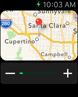 Run the WatchKit app again and check that changes to the Slider object are reflected in the currently displayed map region giving the effect of zooming in and out of the map.