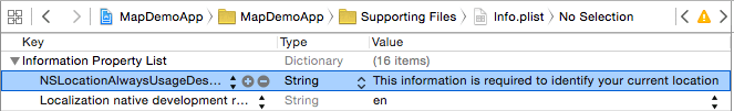 Within the Project Navigator panel, load the Info.plist file (located under the Supporting Files section of the MapDemoApp iOS app target) into the editor. The key-value pair needs to be added to the Information Property List dictionary. Select this entry in the list and click on the + button to add a new entry to the dictionary. Within the new entry, enter NSLocationAlwaysUsageDescription into the key column and, once the key has been added, double-click in the corresponding value column and enter the following text: