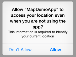 The iOS app must now be run and the location tracking request approved. Select MapDemoApp in the Xcode run target menu and launch the iOS app on a device or simulator session. The first time that the app is launched, the system will request permission to track location information in the background (Figure 26-3). Tap the Allow button to enable this access.