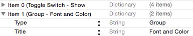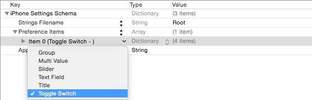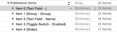 By default, the property list file will contain a group, text field, toggle switch and slider. To view the current preference items, click on the right facing arrow to the left of the Preference Items heading to unfold the list of items: