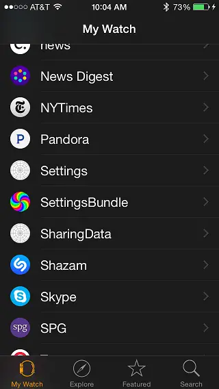 Return to the iPhone, launch the Apple Watch app and navigate to the preferences screen. Note that SettingsBundle app icon appears in the list of WatchKit app: