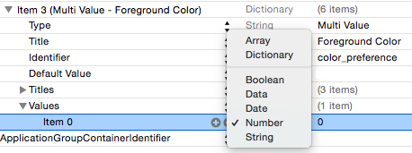 The multi-value control will provide the user with a choice of red, blue or green for the color of the text on the label in the WatchKit app. Add this item by folding the sub-items of Item 2, Ctrl-clicking on the item line and selecting the Add Row menu option. From the list of item types choose the Multi Value option. Edit the values for the new item so that the title reads “Foreground Color” and the identifier is set to color_preference.