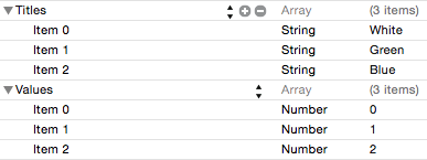 Unfold the new Titles entry (so that the arrow is pointing down) and click on the + button to add the first title to the list which will appear with a key of Item 0. Enter White into the value field for this item before clicking on the + button on the Item 0 line to add the next title. Enter Green as the value for this key. Repeat this step once more, this time setting the title text to Blue.