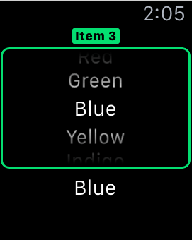 Note that the picker has a green outline as configured and that the caption changes along with the item as the list scrolls.