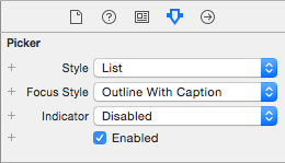 Finally, select the Picker object in the scene and, in the Attributes Inspector panel, set the Style property to List and the Focus Style to Outline with Caption as shown in Figure 26-2: