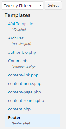 Next, select the Footer (footer.php) entry from the Templates list located on the right hand side of the page as shown in Figure 4-3: