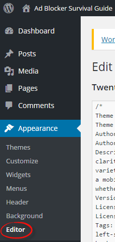 Within the code for the template, scroll down until the </body> tag comes into view and place the bait ad and detection JavaScript code immediately above it: