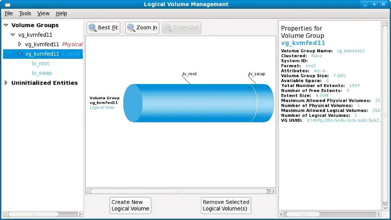 As shown in the above example 6.8GB of the space in volume group vg_kvmfed11 is allocated to logical volume lv_root (for the / file system) and 1.00GB to lv_swap (for swap space). The same information may be obtained from the graphical Logical Volume Management tool by selecting the Logical View: