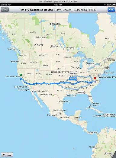 Within the Xcode toolbar, click on the Run button to compile and run the application, either on a physical iPad device or the iOS Simulator. Once loaded, enter an address into the text fields before touching the Get Directions button. The map should subsequently appear together with route between your current location and the destination address. Note that if the app is running in the simulator, the current location will likely default to Apple’s headquarters in California.