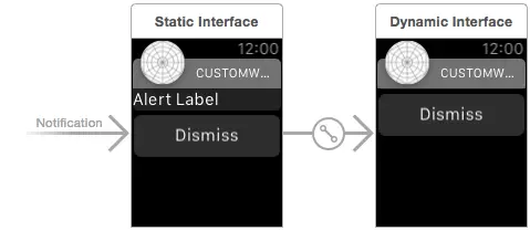 An optional dynamic notification may also be added to the static notification. The dynamic notification scene may also be customized in terms of layout and the addition of non-interactive interface objects. The difference with the dynamic notification scene is that it has associated with it a notification interface controller (subclassed from WKUserNotificationInterfaceController).