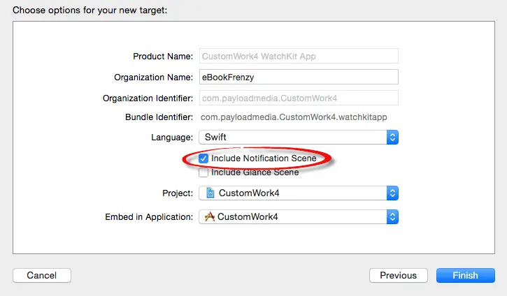 A custom notification can be added to a WatchKit app at creation time by enabling the Include Notification Scene option in the new target options panel as highlighted in Figure 32-3: