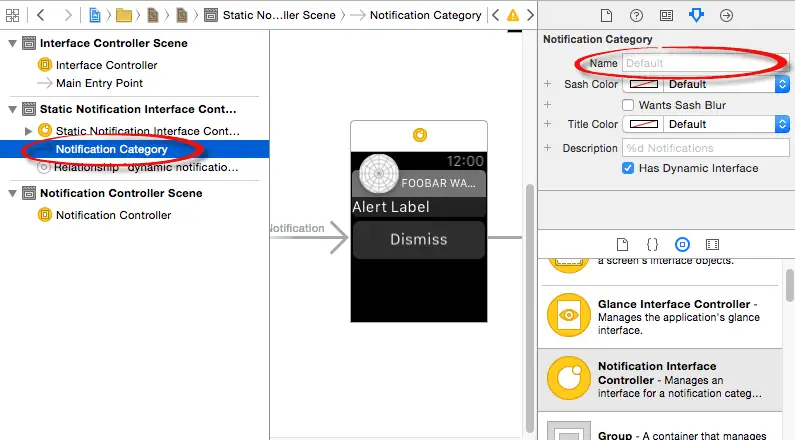 As previously discussed, notifications have an associated category identifier that is used to differentiate one notification type from another within an app. Custom notifications also have a category identifier which can be specified from within the Document Outline panel. To access and modify the category identifier for a custom notification, select the static notification scene and display the Document Outline panel. Within the Document Outline panel, unfold the Static Notification Interface Controller section, select the Notification Category entry and, within the Attributes Inspector, change the Name field to the new identifier string: