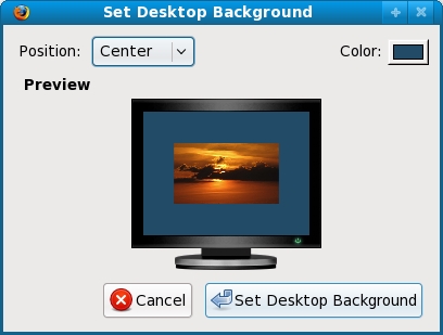 From this dialog select whether the image should be tiled, stretched or centered. If space is going to be visible around the edges of the image be sure to select a suitable color for the border area using the color box. Click on Set as Desktop Background to apply the settings.