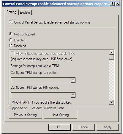 For systems with a BitLocker-compatible TPM a number of other options are available which control whether users are required to create TPM startup keys or use startup PIN. Note that startup keys and PINs are mutually exclusive. If the system requires a startup key then PINs must be disallowed and vice versa.
