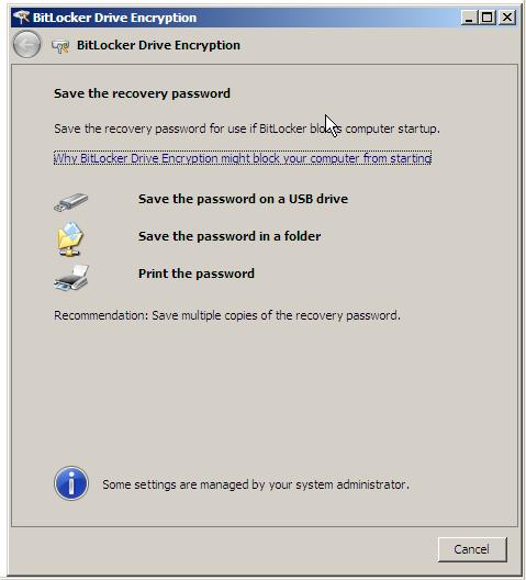 Next, the setup process will request that you save a recovery key. This will be required to unlock the system if BitLocker detects a problem with the integrity of the system (typically if the data on the disk has been tampered with while the system was shutdown):