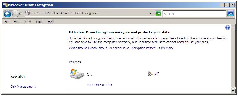 Once the system volume has been created and the system restarted the next step is to enable BitLocker support. The preparedness of the system, and the option to enable BitLocker support are controlled from the BitLocker control panel which is accessed from the system Control Panel (Start->Control Panel).