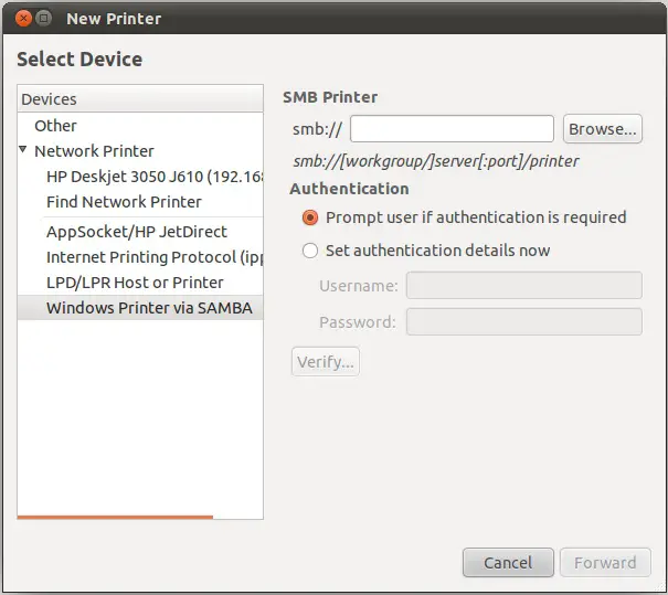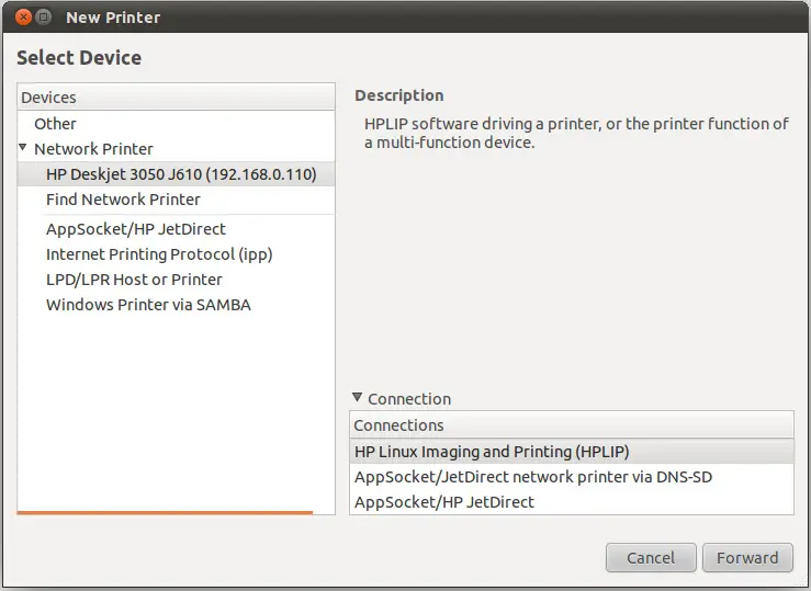 Where hostname is the either the hostname or IP address of the remote system on which the printer is installed and printername is the name of the printer on that system. Click Forward and install the driver for the printer model.