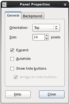 The Size property controls the height (when the panel is in a horizontal orientation) or width (when in vertical orientation). It is not possible to reduce the size to the extent where items will no longer be visible (the minimum value is typically around 23 pixels). A different color or even an image may be specified for the panel background. These settings are available from the Background page of the panel properties dialog: