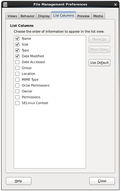 The List view may be further configured to specify which data fields are displayed. In the above figure only the name, Size, Type and Date Modified columns are displayed. These fields are configured via the List Columns page of the File Manager Preferences dialog, accessed via the file manager's Edit->Preferences menu option: