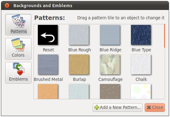 The area of the file manager where files and folders are displayed is presented with a plain white background by default. The color and pattern displayed can be changed using the Backgrounds and Emblems dialog, accessed by selecting Edit->Backgrounds and Emblems: