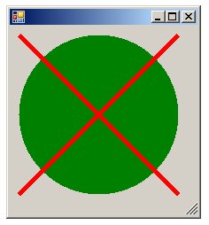 Now that we have covered the basic requirements for displaying graphics using Windows PowerShell and GDI+ it is time to bring it all together in a working example. The following script, when executed, will draw a filled green circle and two red lines: