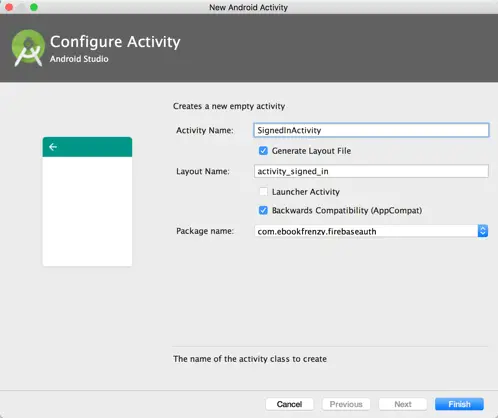 Add this second activity to the project now by locating the app -> java -> <yourdomain>.firebaseauth entry in the Project tool window and right-clicking on it. When the menu appears, select the New -> Activity -> Empty Activity menu option. In the New Android Activity dialog (Figure 4 8), name the activity SignedInActivity: