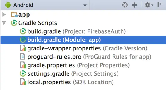 Since this project is going to make use of the FirebaseUI Auth API, two more dependencies need to be added to the module level build.gradle file for the project. Within the Project tool window, locate and double-click on the build.gradle (Module: app) file as shown in Figure 4-5 so that the file loads into the editor: