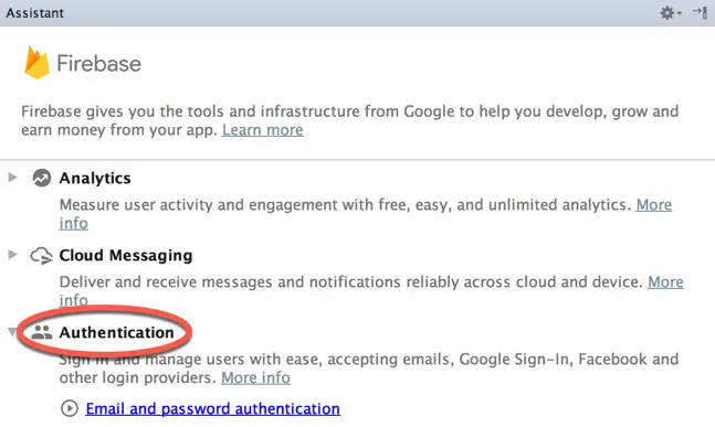 Before an Android Studio project can make use of the Firebase features, it must first be connected to a Firebase project using the Firebase assistant panel. Open the Firebase assistant by selecting the Tools -> Firebase menu option. When the Firebase assistant panel appears, locate and select the Authentication section as illustrated in Figure 4-1: