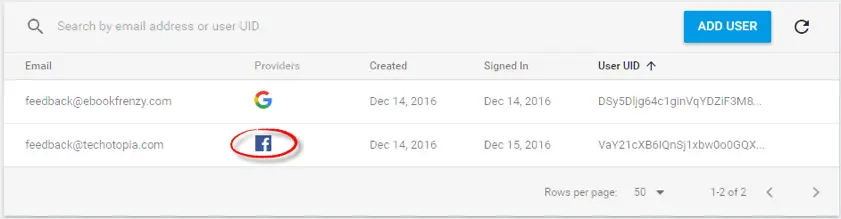 Open a browser window and navigate to the list of users on the Authentication page for the Firebase Examples project where the Facebook account used to gain access to the app will now listed. Since this account was created using the Facebook Login provider, a Facebook logo is included in the Provider column: