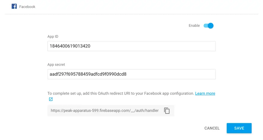 Open a second browser window and navigate to the Firebase console. Select the Firebase Examples project followed by the Authentication option. On the authentication screen, choose the Sign-In Method tab and click on the Facebook provider option. When the Facebook provider dialog appears (Figure 7-5) turn on the Enable switch and cut and paste the App ID and App Secret values from the Facebook for Developers app settings screen into the corresponding fields of the Firebase dialog: