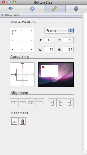In order to ensure the correct layout of the user interface it is necessary to make some changes to the autosize settings of the two buttons. The current settings for a view are accessed from within Interface Builder by selecting the component and displaying the Size Inspector (Tools -> Size Inspector or Command+3). The following figure shows the Size Inspector for the top button in our user interface: