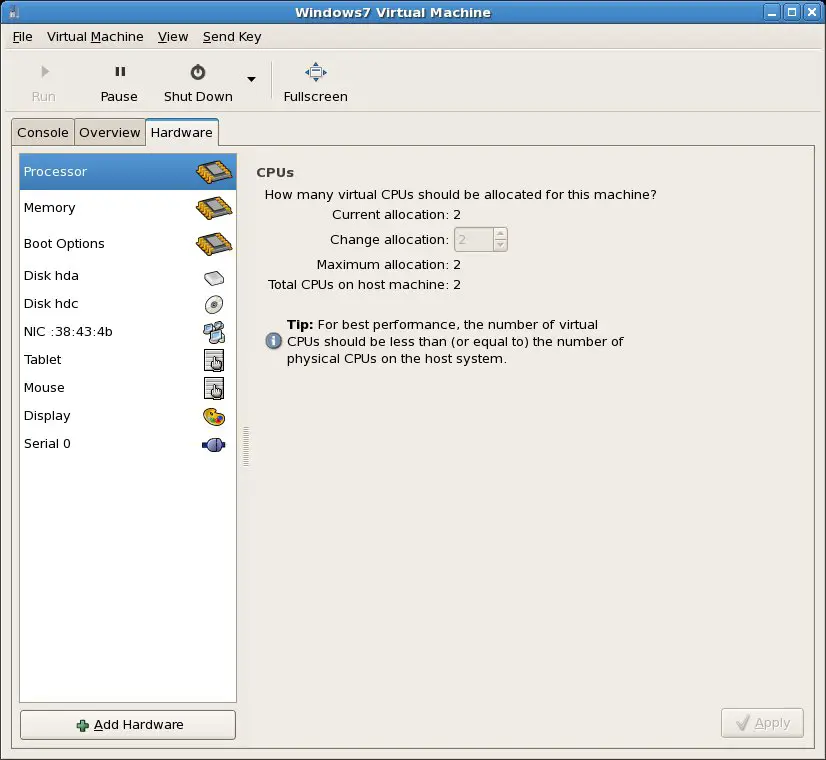 During the initial configuration of the guest OS in virt-manager a number of resources such as memory allocation and CPU usage were defined. It is common to discover after the guest OS starts running that these settings need to be changed. Fortunately, virt-manager makes it easy to change these settings, though it is important to note that some settings (such as the number virtual CPUs and current memory allocation) can only be changed when the corresponding virtual machine is shut down.
