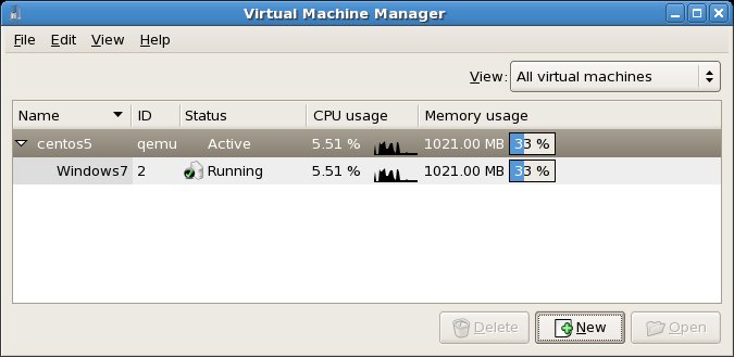 The following screenshot shows the virt-manager tool running on a CentOS system. It lists one connected host system (named centos5), and one guest virtual system named Windows7 which is currently running:
