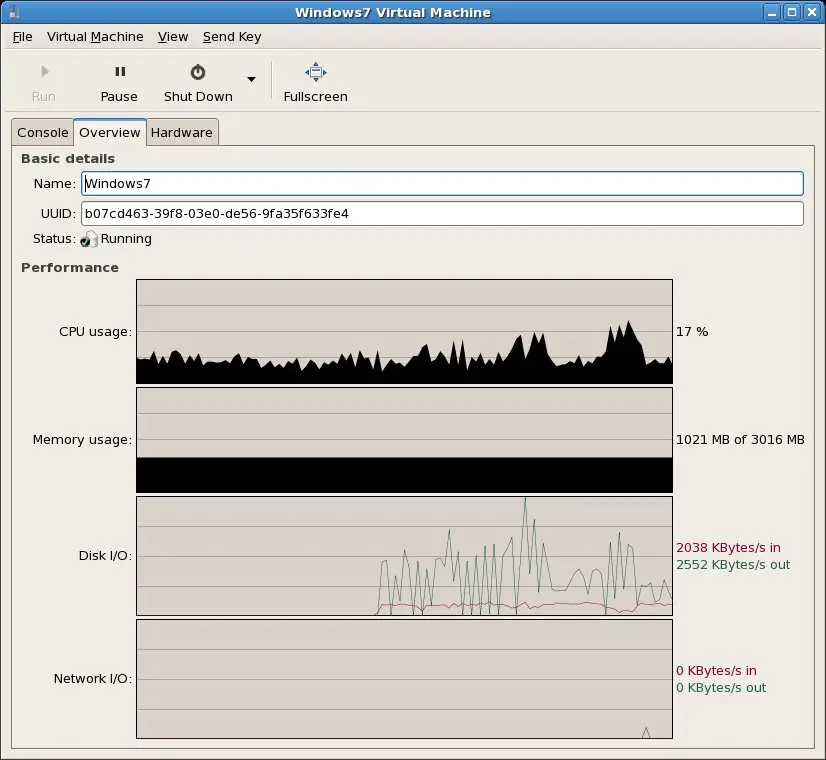 To view the performance graphs, display the virtual machine console window (double click on the guest in the virt-manager window) and select the Overview tab. The performance screen will display real-time graphs showing the performance statistics for the selected guest: