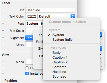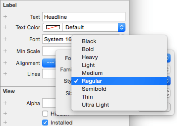The system fonts use the same Apple San Francisco font family as the text style font options outlined earlier in this chapter. Unlike text styles, however, system fonts allow attributes such as point size and style (italic, bold etc) to be selected. System font sizes, however, are not subject to the prevailing preferred content size category setting and should be used only when the required results cannot be achieved using text style fonts. As with text style fonts, system fonts may be selected at design-time within Interface Builder, or specified dynamically in the code of an interface controller.