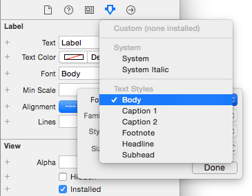To configure the text style of an interface object in Interface Builder, select the interface object to which the style is to be applied, display the Attributes Inspector and click on the “T” button in the Font setting field. From the drop-down menu click on the Font menu button and select an item from the options listed under the Text Styles heading:
