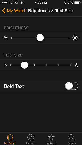Apple Watch users are able to specify a preferred text size which WatchKit apps are expected to adopt when displaying text (also referred to as the preferred content size). The current text size can be configured via the Apple Watch app on the paired iPhone device. To access this setting, launch the Apple Watch app, select the My Watch tab followed by the Brightness & Text Size option. As shown in Figure 23 1, options are provided on this screen to adjust the font size and use bold text.